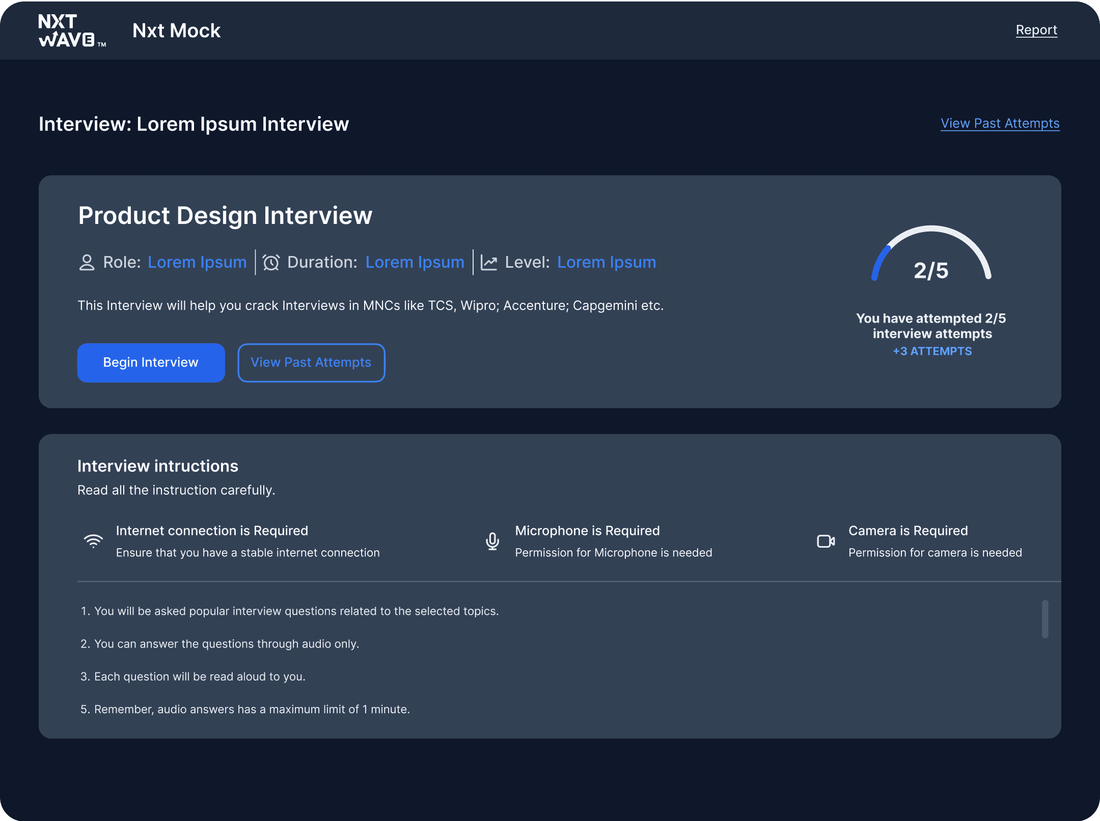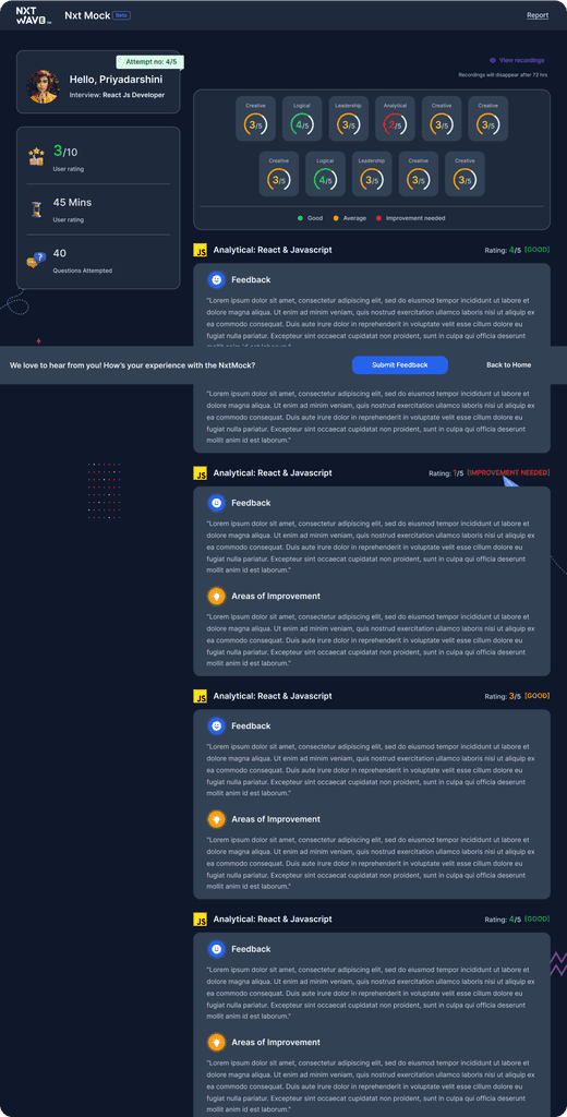 As the Lead Designer, I owned the end-to-end design process—right from initial user research to delivering a seamless, responsive product experience. My focus was to ensure NxtMock was intuitive, engaging, and genuinely useful in improving user confidence.